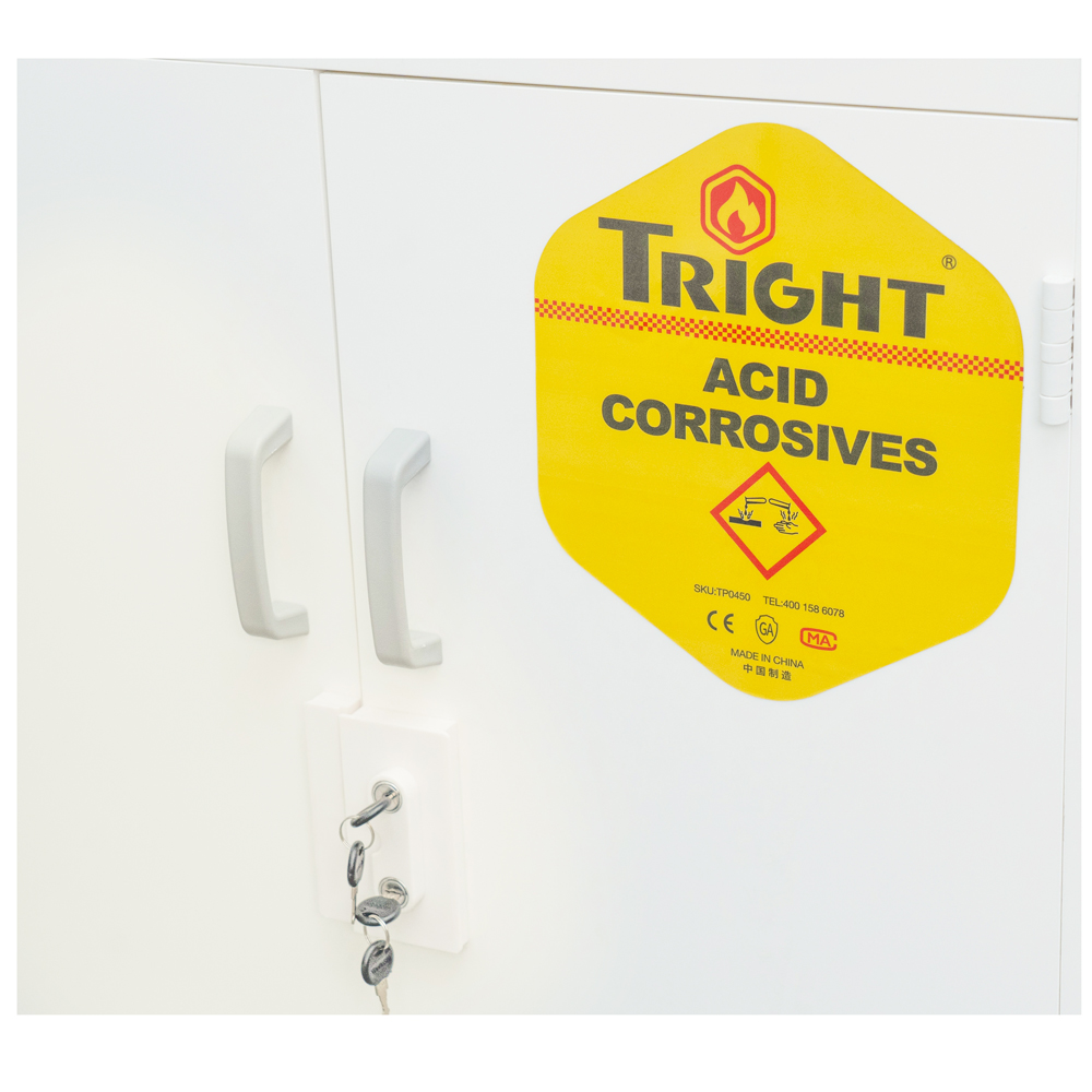钛汭Tright ®PP耐腐蚀性化学品存储柜,采用聚丙烯材料折弯焊接而成,外表整体简洁美观,内部结构稳定抗冲,耐强酸强碱性化学品,不腐蚀不磨损,双人双锁安全合规管理。